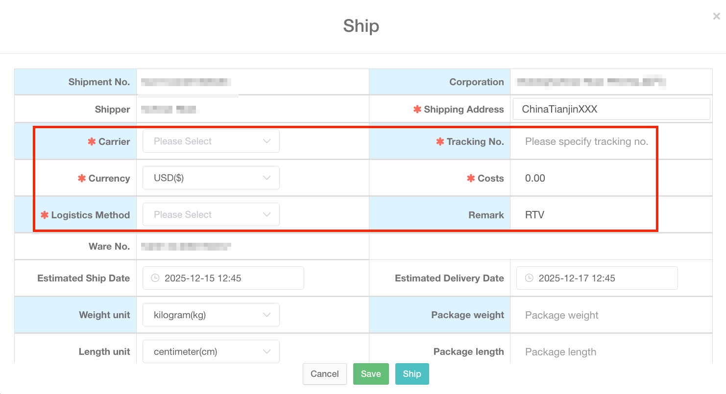 Service Center search for shipment orders in "Logistics → To Be Shipped" and use the "RTV" filter, fill in the logistics information, and confirm the shipment.